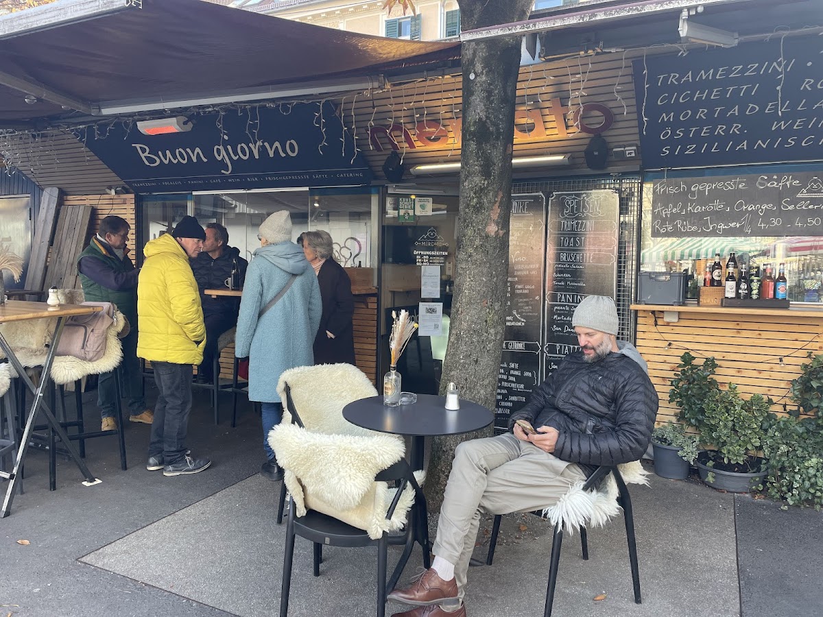 Familiär, durch ein junges, dynamisches, freundliches, symphatisches Team, geführt. Die Tramezzini sind Goldstandard, der Espresso grande und die weiteren mediterranen Köstlichkeiten höchst empfehlenswert. Hoher Wohlfühlfaktor inklusive Mercato feeling.